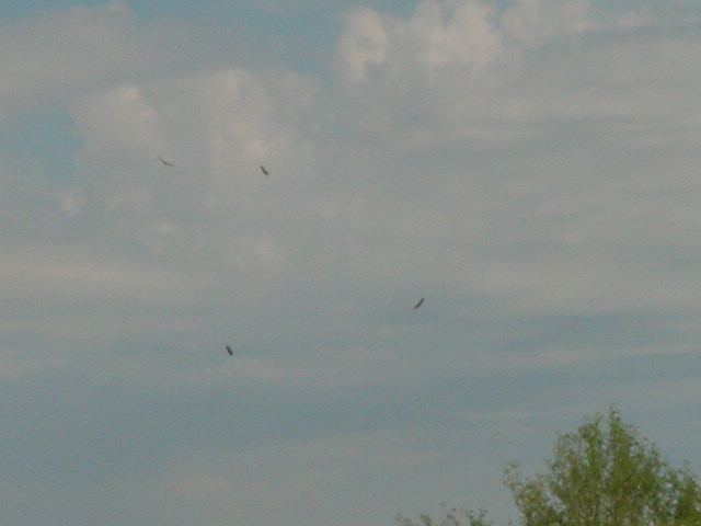 It may be hard to make out what this is a photograph of, but it’s vultures. Buzzards. Whatever you want to call them. They spotted me working outside and you can tell they’re thinking “Oh, hot dog! If the big guy keels over, we’ll eat like kings!”