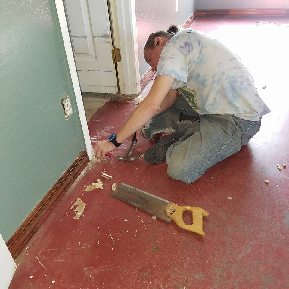 Next, John had to trim the bottom out of the door frames in the room. A couple of years ago we had lusted after a power multi tool we’d seen at home depot. At the time, we were building all the patio and backyard furniture and we had plenty of power tools. While the multi tool was groovy, we didn’t think it would do anything more than our already large power tool collection would do. We were wrong. We should have gotten it. Then, because it was groovy, now because it would have taken John a mere few minutes to cut space under those door frames rather than the hour of blood, sweat and angst it took him to hack saw and chisel through the petrified wood on 3 door frames.