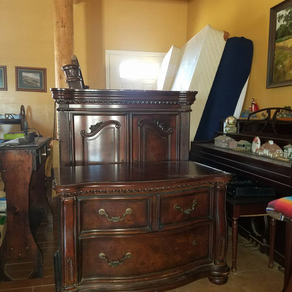 We positioned one end of the massive headboard (did I mention massive?) on our cheap little rolling cart, John held up one end and walked while I pulled the cart out into the den and into the entry. Somehow, without sending the cart through the glass patio door or the sheet rock in the bedroom, John managed to lower the top half of the armoire onto that same cart and we were able to roll it out as well. There were a few marked gasps in both of these endeavors but we made it through them with no damage to ourselves or the house.