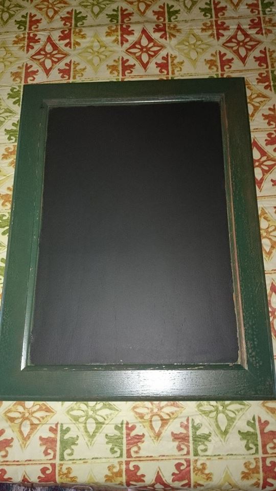 I have finally recognized a need for a chalkboard. Not enough of a need, mind you, to paint an entire wall or back splash with a writing surface, but a need for a larger reminder than sticky notes provide. I chose a 16 and 1/4 x 21 and 1/2″ cabinet door from my pile. (This is also a good size for a large serving tray.)