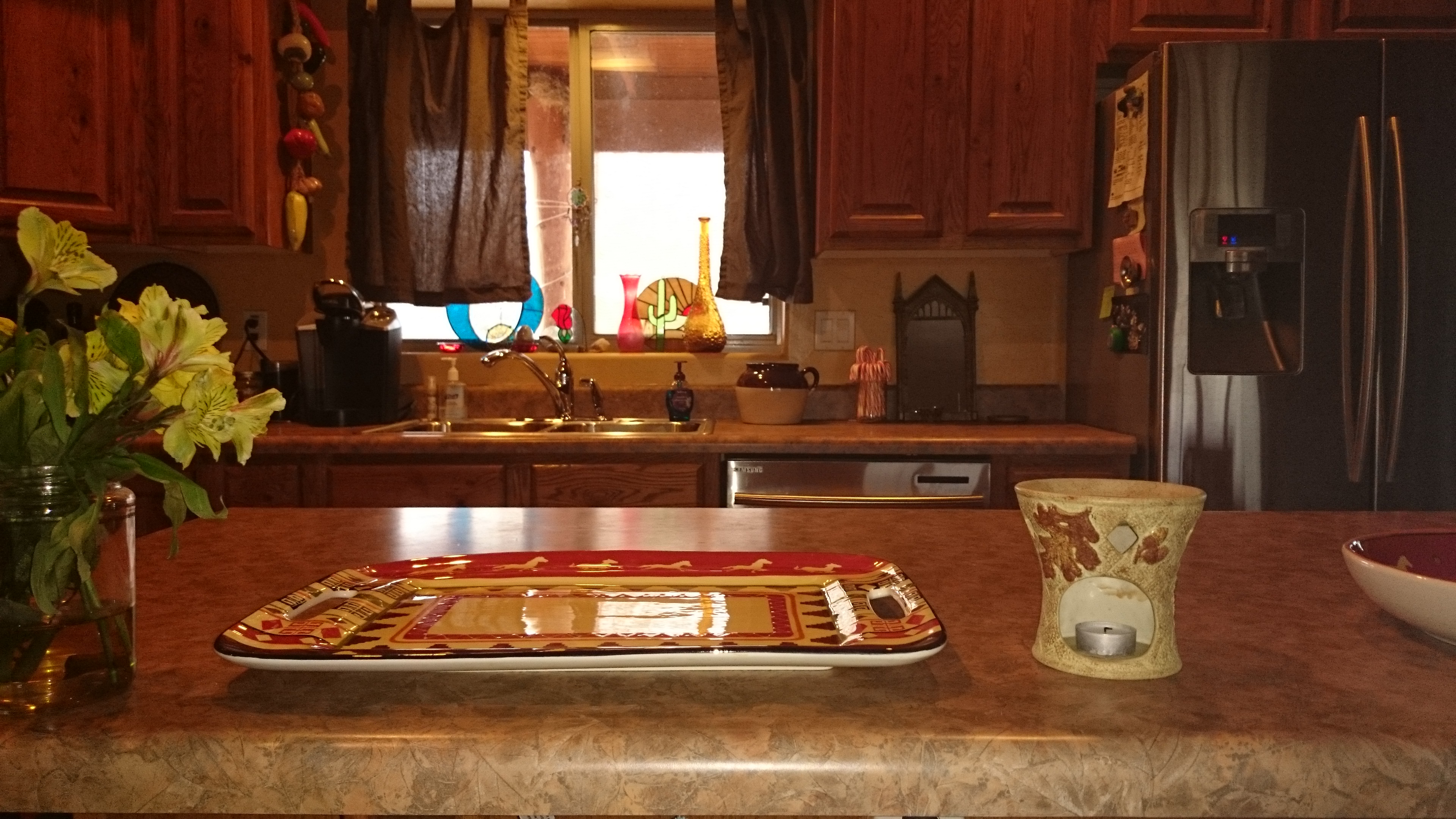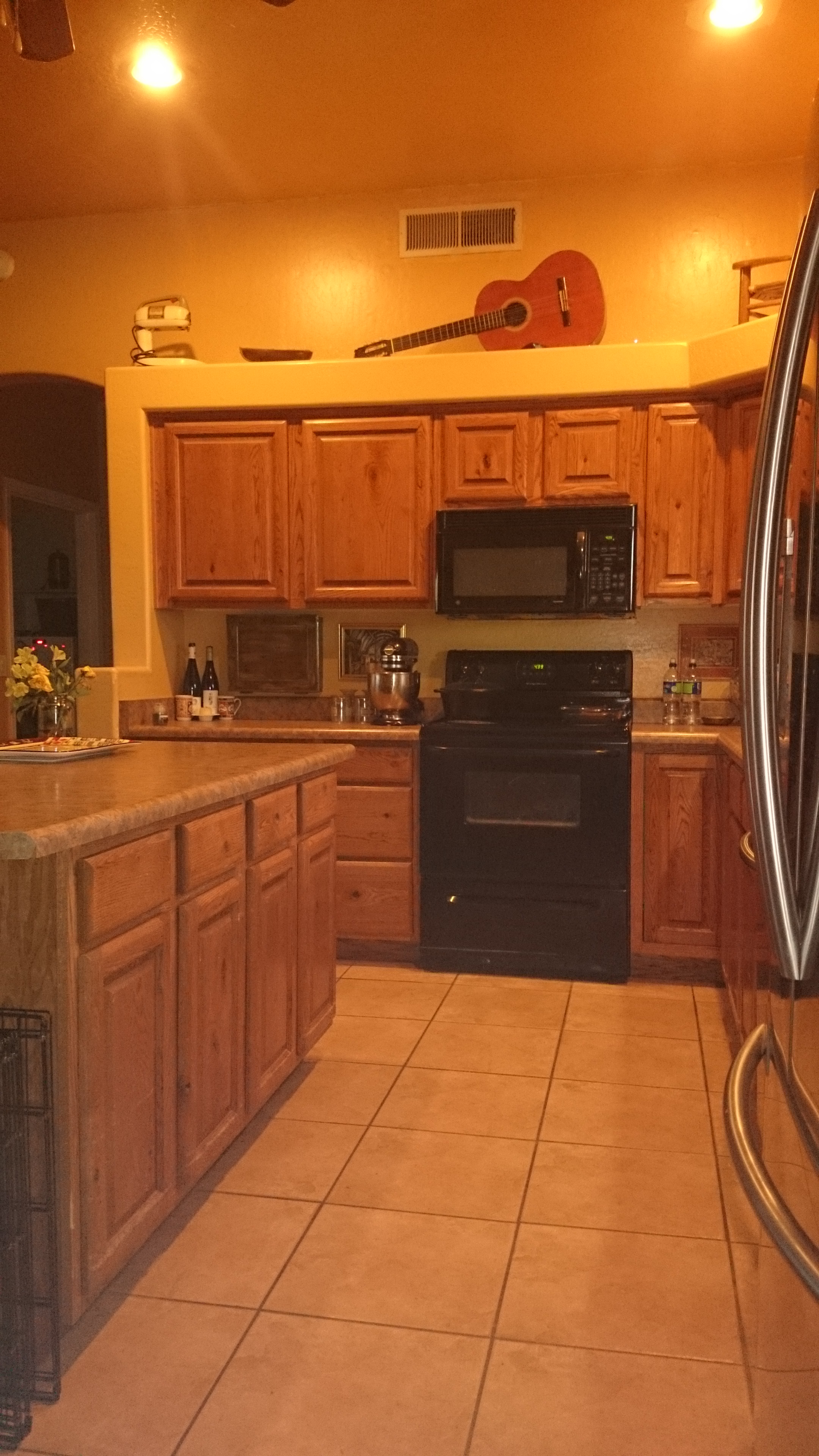 Long view of my dazzlingly clean and uncluttered kitchen. John even climbed up on the counters and deep cleaned the grucky no-woman’s land known as the pot shelf.