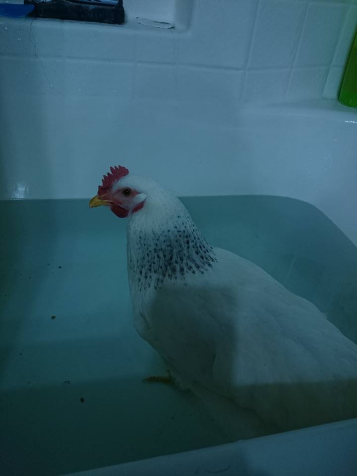 Momma said there’d be days like this… well no actually, she didn’t. There is no way in my Momma or Grandmomma’s wildest imaginations they could have envisioned a day where I’d have a chicken soaking in a warm bathtub rubbing Vaseline on her egg production *facilities*. I told friends earlier that as long as she doesn’t request a glass of wine, bubble bath and candles I’ll deal with it.