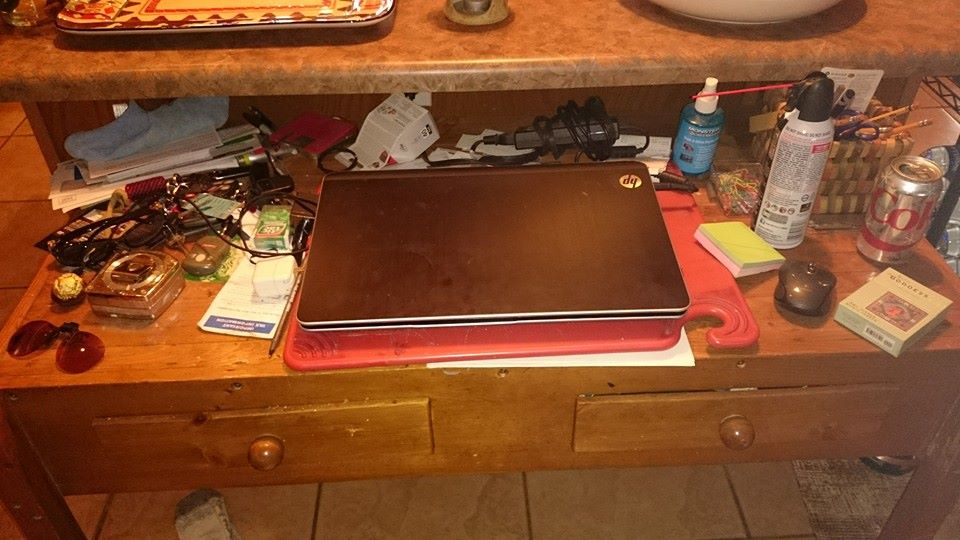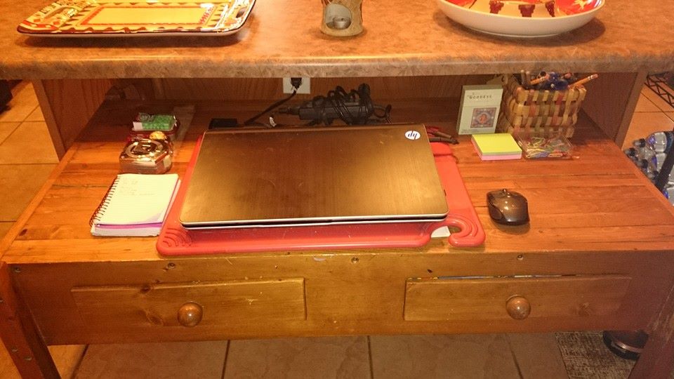 Once the table was built, I painted it and shuffled the stuff back from the kitchen to the closet shelves, with more than one “Oh God don’t let this kill me” as I lugged cases of bottled water.