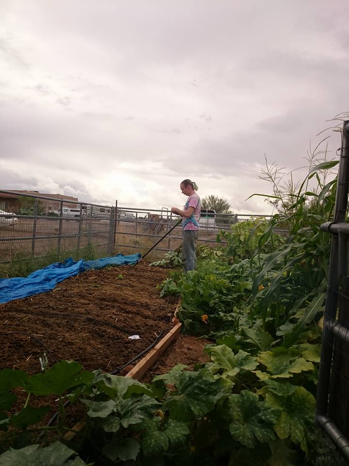 Because we had gone quite garden/free food crazy, we decided to start another bed in the backyard adjacent to the patio. For years there had been a large lush creosote bush in that spot. For unknown reasons, that bush suddenly died and had to be taken out. The bush had provided a good bit of shade on our west facing patio. I wanted to replace it with something that would provide shade, but couldn’t find anything suitable so the spot remained bare. As we watched the vines in the larger garden doing their best to turn the barn into a tall, green mound, we realized that a small garden in that spot could not only provide food, but if we gave vines something to climb, we’d have shade as well.