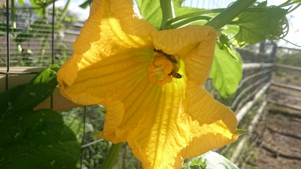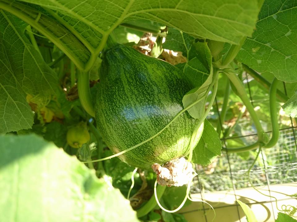 Meanwhile, the squash vines are still producing and still spreading. They’ve reached the hay room fence and have also spread over the top of the south facing stall wall. There are 5 new squash on the south facing fencing alone and 4 more growing within the main garden. The squmpkin is almost completely orange now and quite a bit bigger than a basketball. Time to hunt down more squash recipes.