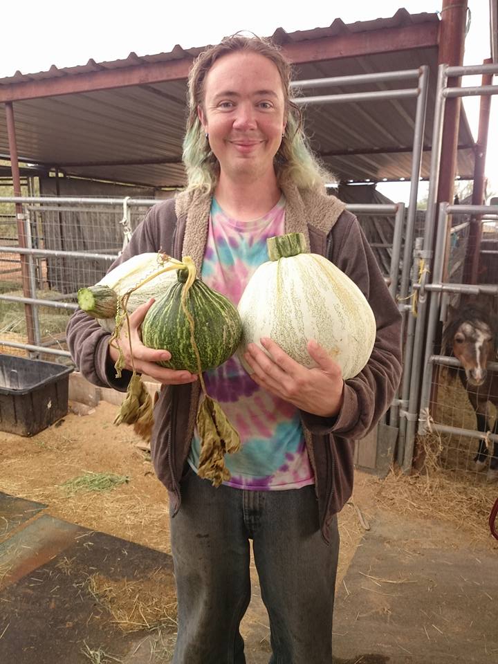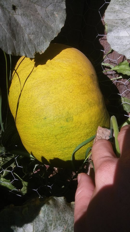 While checking the garden one morning, I discovered several new mayo arrote squash developing on the vines climbing the stall walls. Following the vine, checking for more, I found a bright orange and green squash about the size of a baseball, hiding in the leaves. Mayo arrote squash are a very pale color with light green mottled stripes. As they mature, some of them will develop a few bright yellow streaks. None, however, are orange. There are a few types of squash which can cross pollinate. Mayo arrote and pumpkins are, apparently, two of those types of squash. We have a Squmpkin. A BIG squmpkin. It’s entertaining, but not something that needs to be repeated. When we plant next spring, we will be sure to keep the two well separated.
