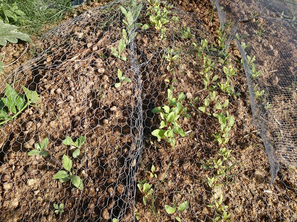 I had posted on our local small town Facebook group that I needed old chicken wire and leftover bits of hardware cloth to protect the seeds and sprouts from those birds with divining powers. We ended up with an abundance of free wire that just needed a bit of straightening to make protective tents. I noticed this morning, however, that I’m going to have to hit the plants with a bit of Neem oil as some of them are mildly bug chewed. Everything has sprouted well and looks happy, except the onions. We’ve had a very few onions sprout. However, when we were out and about last week we picked up a tray of red, white and brown onions to plant just in case. If the others sprout, terrific, there’s no such thing as too many onions in my kitchen.