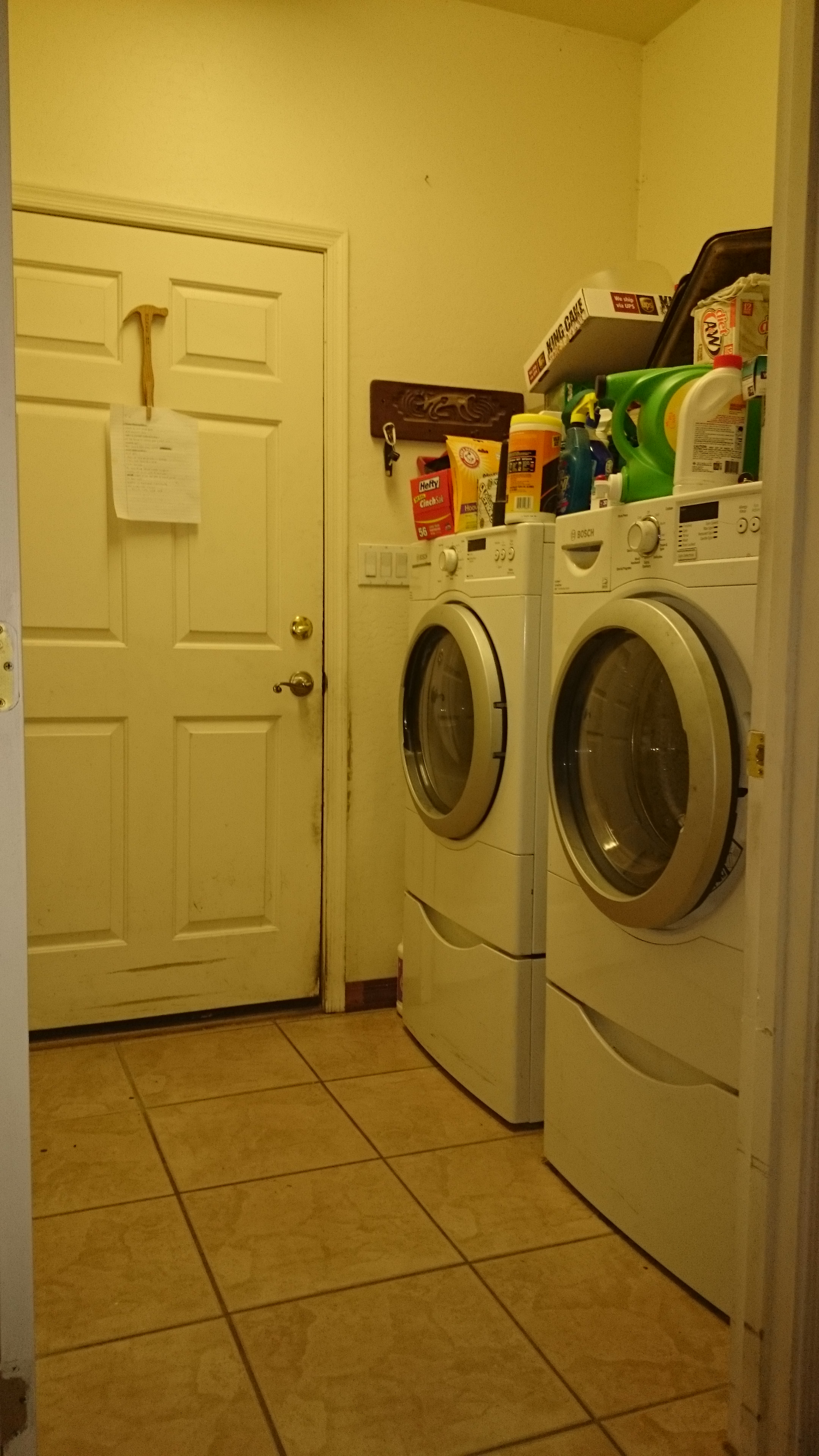 This will be my month long, every spare moment, project. I have wood, I will build storage. My son and I build a backyard filled with furniture including a beautiful storage bench, I know we can insert a storage bench in the laundry closet. I have drills, I will remove doors. I have imagination, I will figure out something to cover the entry into the laundry room so that I don’t have to stare at the washing machine. I will build a better over head shelving system that actually works and that I can actually reach. The room will have a “landing strip” and a way to hang coats. All in a space the size of some walk in closets. Well, that’s the plan anyway!